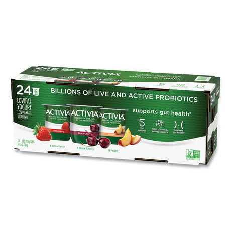 $7286$8014Unit price /UnavailableActivia Probiotic Lowfat Yogurt, 4 oz Cups, Black Cherry/Peach/Strawberry, 24/Pack (90200477)