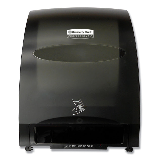 Reduce the hassle of restroom maintenance with the high-capacity Kimberly-Clark Professional Automatic Towel Dispenser. This touchless, wall mount roll towel dispenser needs infrequent refilling and provides consistent, reliable performance. Your washroom guests will enjoy the benefits of hygienic, touch free dispensing - they'll only touch the towel they're using. This high capacity towel dispenser is made of high impact smoke colored plastic. The unit dispenses a nominal 11" of towel when activated by placing hand under the unit. A second sheet will dispense at 10% reduced length when activated within a few seconds. Features include a quiet dispensing system, quick load capability and choice of key-activated spring lock or push button operation. Towels Dispensers Type: Hardwound Roll Towel Dispenser; Capacity (text): 950 ft Roll; Material(s): Plastic; Color(s): Black.