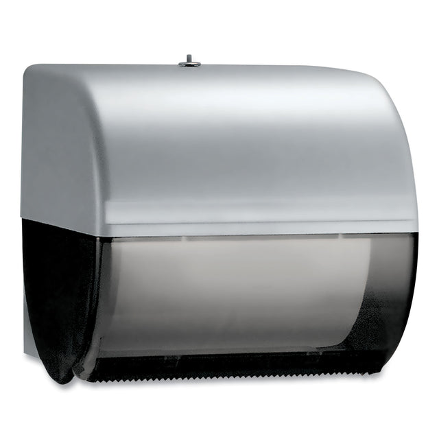 High-impact grey plastic with smoked transparent cover. Compact dispenser perfect for areas with limited wall space. Holds up to 1000 feet of towels. No-touch dispensing helps reduce cross-contamination. Non-restrictive design allows user to take length of sheet desired. Towels Dispensers Type: Roll Towel Dispenser; Material(s): Plastic; Color(s): Smoke/Gray; Depth: 10".