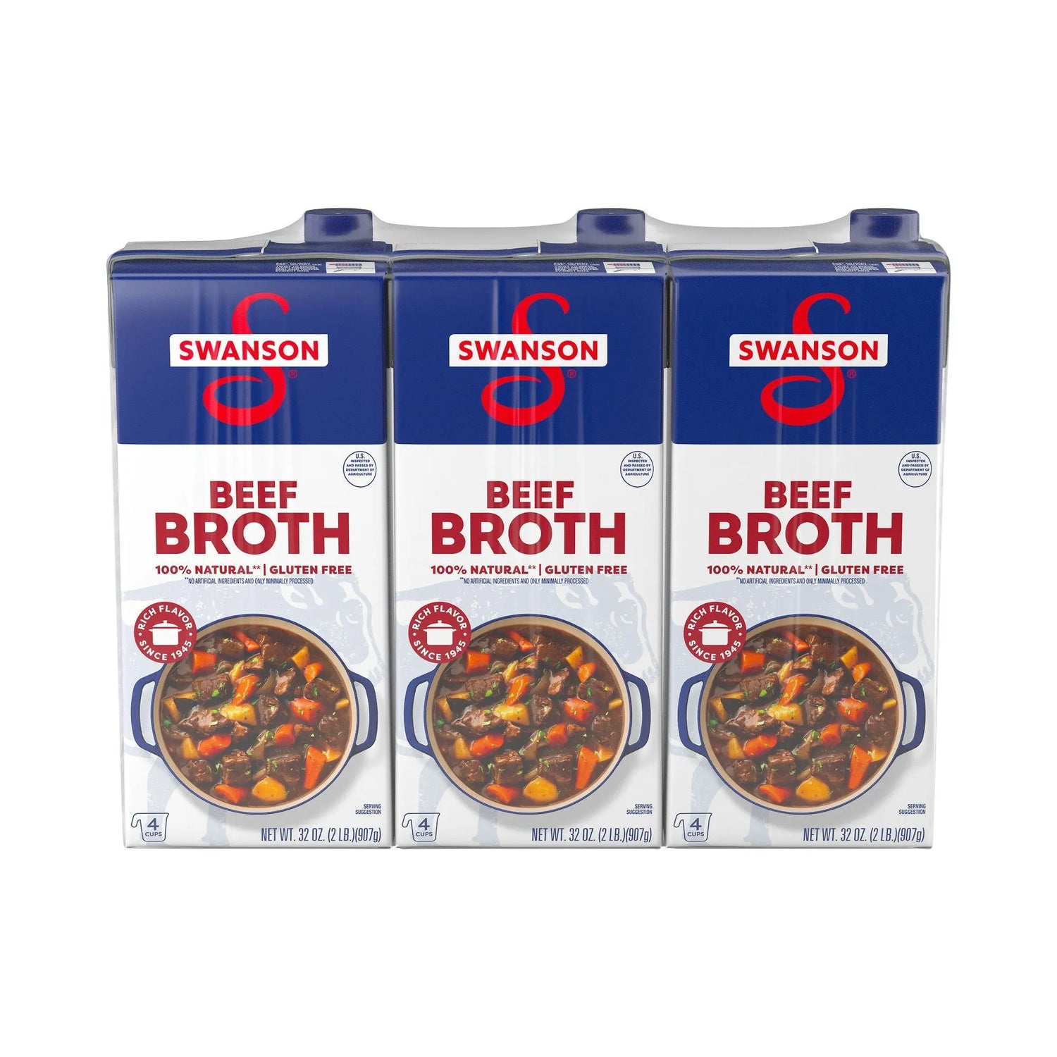 Elevate your homemade meals with the rich roasted flavor of Swanson Beef Broth. Swanson Beef Broth brings together the perfectly balanced flavors of roasted beef and vegetables picked at the peak of freshness in a convenient recyclable carton. And just like homemade, our broth uses only 100% natural, non-GMO ingredients, with no MSG added**, no artificial flavors or colors, and no preservatives. More convenient than beef bouillon, this gluten-free beef broth is a versatile ingredient for your everyday cooking, adding flavor and moisture to both entrees and side dishes. It’s great as a stew or soup base, and it can be used instead of water to boost rich flavor in rice, pasta and veggies. Swanson Beef Broth is a must-have for your holiday cooking, bringing richer, elevated homemade flavor to beef-centered recipes such as pot roast, brisket and more. It’s not just any broth. It’s Swanson. Product Features: Three 32 oz. recyclable cartons of Swanson 100% Natural Beef Broth Perfectly balanced flavors of roasted beef and fresh-picked vegetables Gluten-free beef broth made with 100% natural*, non-GMO ingredients; no artificial flavors or colors and no preservatives *No artificial ingredients and only minimally processed Use it to add flavor and moisture to entrees and side dishes, as a soup base, or in place of water to boost rich flavor in rice and pasta A must-have for your holiday cooking; adds richer, elevated homemade flavor to beef-centered recipes such as pot roast, brisket and more Not just any broth. It’s Swanson Includes three 32 oz. cartons **Except for the small amount naturally occurring in yeast extract