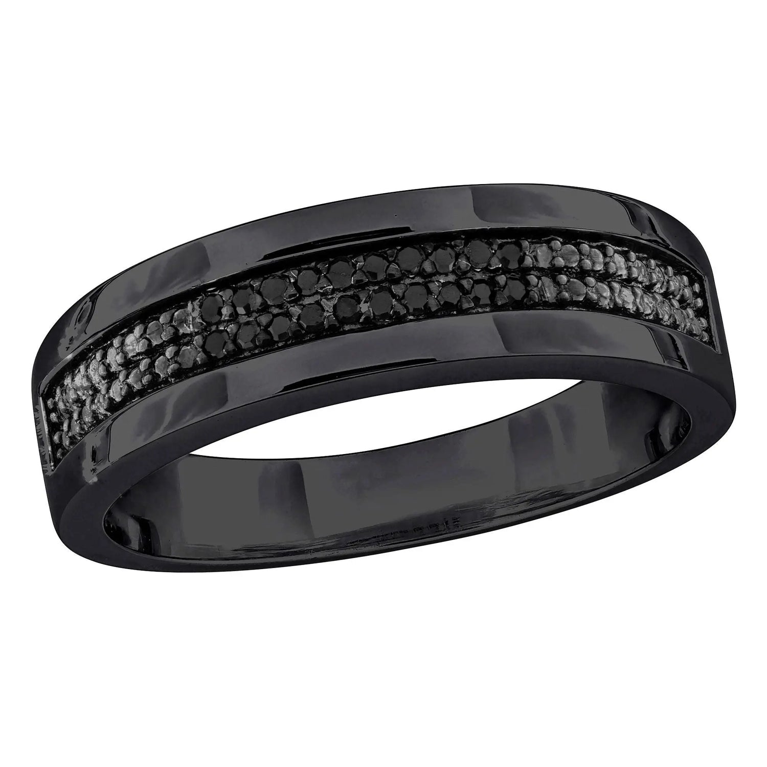 Experience the epitome of modern sophistication with this Men's Black Diamond Ring. Meticulously crafted in sleek sterling silver with a striking black rhodium plating, this ring boasts a captivating double row of black diamonds, exuding an aura of understated luxury. Whether chosen as a wedding band or a fashion-forward accessory, this ring strikes the perfect balance between delicacy and elegance, making it a versatile addition to any ensemble.Product Features:Set in Black Rhodium Silver.1 ct. t.w. DiamondDiamond Quality: Black DiamondHigh Polish FinishIncludes Men's 0.1 ct. t.w. Black Diamond Double Row Anniversary Ring in Black Rhodium Silver