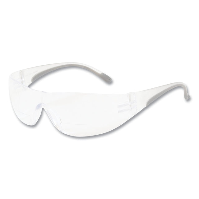 Wraparound, rimless design provides excellent protection from projectiles and impacts while ensuring crisp, clear, distortion-free visibility. Thin, flexible temples and a molded saddle bridge deliver a secure, pinch-free fit for all-day wearing comfort. 9.5 BCR (Base Curve Radius). Z12R Bifocal Reading-Glass Design1.1" wide magnifier reading segments. Style: Wraparound; Frame Color: Clear; Frame Material: Plastic; Lens Material: Polycarbonate.