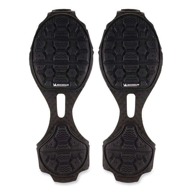 TREX Spikeless Traction Devices for shoes reduce the risk of slips and injuries by providing spike-free traction on slick surfaces. Powered by Soles by Michelin, these are the industry's most advanced spikeless traction device. Designed for work environments where spiked ice cleats are not preferred, these shoe and boot grips make for easy and safe transition between indoor and outdoor. To achieve traction without spikes, the treads are constructed with a Michelin ice control compound, the same innovative technology found in their winter driving tires. Strategically placed grooves allow for efficient water evacuation when pressure is applied. Preventing water build up is particularly beneficial on smooth indoor surfaces. Micro-pumps increase adhesion by properly distributing pressure to maintain high surface contact on icy surfaces. The tread is designed with block sipings that create additional surface area for increased grip on snowy surfaces. Footwear Type: Traction Device; Size Group: X-Large; Material(s): Rubber; Color(s): Black.