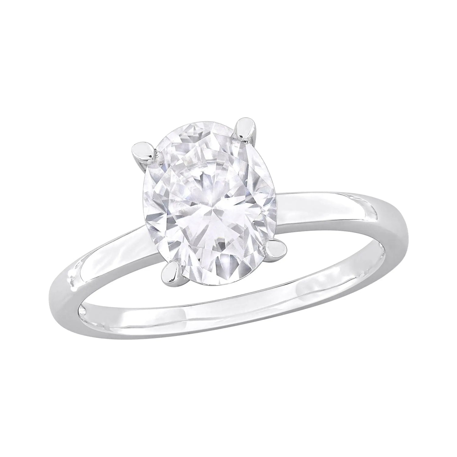 Elevate your proposal with this stunning Moissanite Solitaire Engagement Ring in Sterling Silver. This classic and timeless ring features a brilliant 2 ct. DEW oval-cut created moissanite center stone, beautifully set in a lustrous sterling silver band. With its dazzling sparkle and elegant design, it's the perfect symbol of your love and commitment.Product Features:Set in sterling silver2 ct. DEW created moissaniteHigh polish finishIncludes solitaire ring