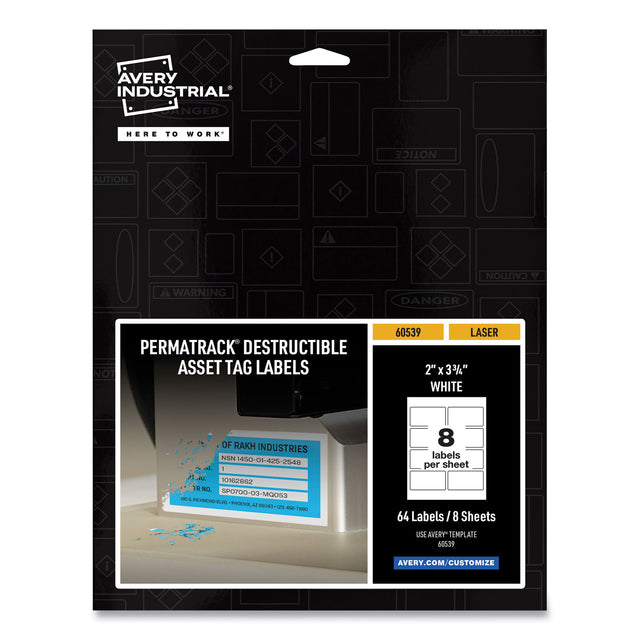 Avery PermaTrack Destructible Asset Tag Labels, Laser Printers, 2 x 3.75, White, 8/Sheet, 8 Sheets/Pack (60539)