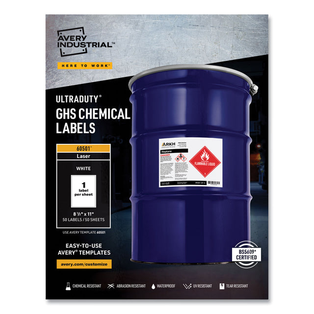 Avery UltraDuty GHS Chemical Waterproof and UV Resistant Labels, 8.5 x 11, White, 50/Box (60501)