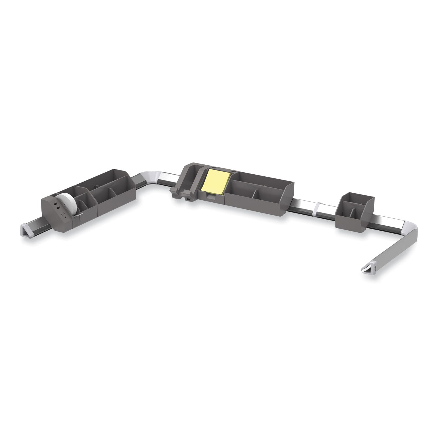 Use this 17-piece Konnect office organizer kit to give your office a makeover and do away with all that distracting clutter. It all starts with the cord management rails. This kit comes with two long and short rails that you can connect together using the corner connectors and extenders. Dock all your connect products to the rail also for zero movement. Tuck messy wires into the rail to automatically clear your desktop of excess. You also get two wide and short storage bins that hold all sorts of items. Have loose pencils lying around everything? Place them into one of the storage and pencil holders so they're safely concealed in a single location. Each bin comes with modular dividers and removable lids for further organization. Everyone needs tape at their desk. The tape dispenser is super compact and has an easy-cutting blade. Plus, it includes a single roll of office tape. The card holder is unique as it holds business cards and sticky notes, and comes with a yellow sticky note pad to start you off. Time to charge up! The phone dock provides a resting spot for your phone while charging it with the USB port. Desktop Supplies Organizer Type: Multipurpose; Number of Compartments: 17; Overall Width: 4.02"; Overall Depth: 31.69".