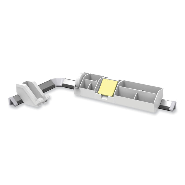 The short and wide storage bins hold everything from pens and paper clips to your favorite lip balm. The tape dispenser is slim and provides easy cutting. The sticky note holder safely displays important sticky notes and business cards. It even has two integrated holders for pens and pencils! Included is a single roll of office tape and a yellow sticky note pad with these items. The USB phone dock allows for easy use and viewing of your phone while charging it with the USB port. This Konnect desk organization system offers zero clutter in your office or at-home workspace. Use the slatwall hooks, screws or drywall anchors for staple mounting. Desktop Supplies Organizer Type: Multipurpose; Number of Compartments: 6; Overall Width: 4.02"; Overall Depth: 23.54".