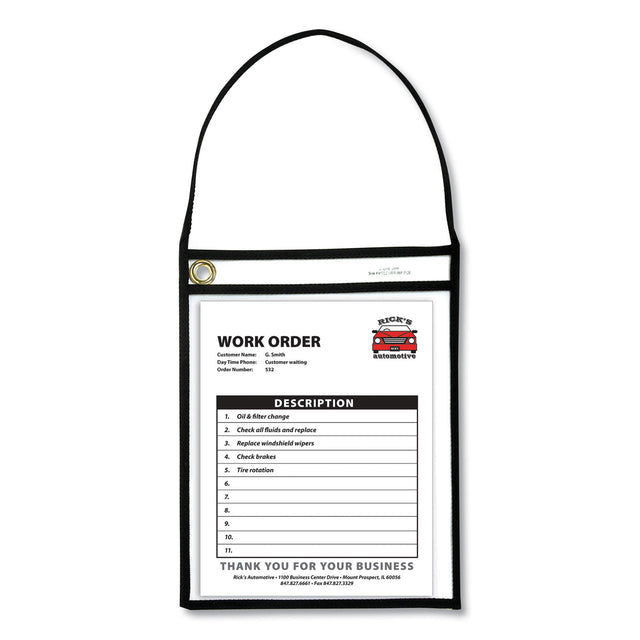 Store, protect and organize your instructions, production schedules, inventory cards, work orders and much more. The convenient strap allows you to hang the job ticket on a car mirror or factory machine, while you are working on the job. Great for hooks, pegs, vehicle mirrors or machinery. Super heavyweight holder has stitched seams for long-lasting utility. Keep the information with the job! This product will be cheerfully replaced with one of equal value if defective in materials, manufacturing or packaging at the time of purchase. Except for such replacement, this product is sold without warranty or liability even though defect, damage or loss is caused by negligence or other fault. Clear Back & Oversized Corner Eyelet -- Black Stitching & 22" Strap. Load Orientation: Top; Sheet Capacity: 75; Sheet Protector Type: Shop Ticket; Insert Size: 9 x 12.