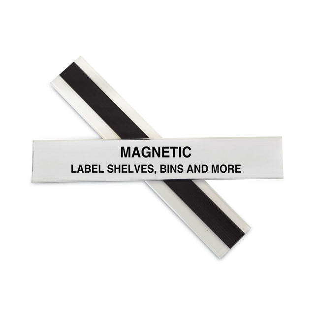 Label shelving units, racks and more with ease and efficiency. Magnetic clear plastic holders stick to virtually any clean, flat surface. Relabeling is simple, just slide in new white paper insert (included). Can be cut to any size. Comes in a length of six inches. This product will be cheerfully replaced with one of equal value if defective in materials, manufacturing or packaging at the time of purchase. Except for such replacement, this product is sold without warranty or liability even though defect, damage or loss is caused by negligence or other fault. Color(s): Clear; Size: 1 x 6; Load Style: Side; Material(s): Plastic.