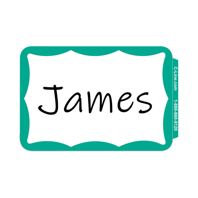 Unique tabbed edge makes it easy to peel off the badges' backing and apply. Ideal for small meetings, seminars and conferences. Do not apply to vinyl, leather, suede, corduroy or silk. This product will be cheerfully replaced with one of equal value if defective in materials, manufacturing or packaging at the time of purchase. Border-Style. Orientation: Horizontal; Name Badge Label Length: 2.25"; Name Badge Label Width: 3.5"; Name Badge Label Color(s): White/Green.