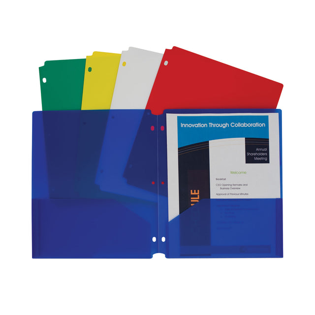 Two-pocket heavyweight polypropylene folders with three-hole punch hold papers and resist tearing. Features three-hole punching for secure storage in standard three-ring binders. Cut-outs at the top and bottom keep portfolio from being caught in binder open-close mechanism. This product will be cheerfully replaced with one of equal value if defective in materials, manufacturing or packaging at the time of purchase. Except for such replacement, this product is sold without warranty or liability even though defect, damage or loss is caused by negligence or other fault. Front Cover Color(s): Assorted; Color Family: Multicolor; Back Cover Color(s): Assorted; Sheet Size: 11 x 8.5.