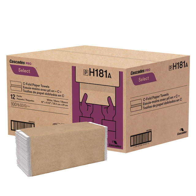 Cascades Select Folded Paper Towels, C-Fold Towels, 1-Ply, 3.75 x 10, White, 198 Towels/Pack, 12 Packs/Carton (H181)