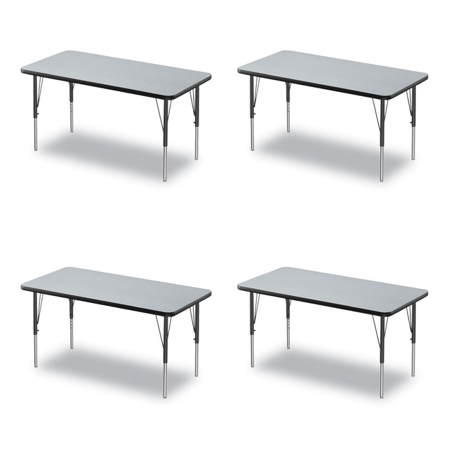 Outfit your classrooms with Correll Height Adjustable Activity Tables. Sturdy, ultra-durable top features a thermally fused laminate surface for superior scratch and stain resistance along with a fully sealed high-density fiberboard core to prevent moisture contamination, minimizing the potential for warping. The top is also surprisingly easy to cleanfood and beverage spills, crayon marks and most paint spills wipe away with a damp cloth. A full-perimeter, T-mold PVC band softens and protects the tops corners and edges, and four height-adjustable steel legs with hairpin braces adjust in 1" increments to accommodate students of all agesfrom kindergarten to adult learning. Simply use the included speed-wrench for fast and easy height adjustments. Easy to assemble with pre-attached leg-mounts consisting of seven-screw mounting brackets and three-screw leg plates. A shoulder built into the legs set screws provides an extra measure of stability, even if the leg brackets are less than fully tightened. Tables are built to order and ship on a pallet to accommodate commercial addresses with loading docks. Top Color: Gray Granite; Color Family: Gray; Base Color: Black/Silver; Top Shape: Rectangular.
