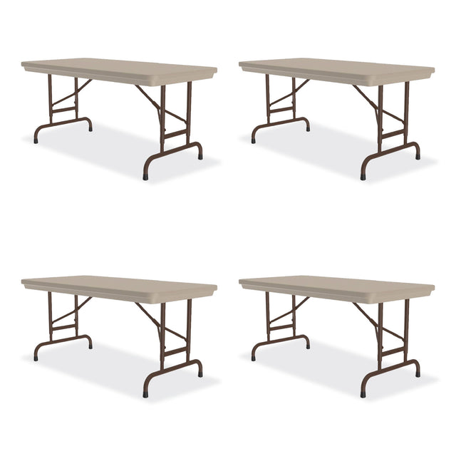 Do more with Correll Commercial Height Adjustable Plastic Folding Tables. These heavy-duty tables can adapt to nearly any event, any task, indoors or out. Simply adjust the height in 1" increments to fit the occasion. Virtually indestructible, blow-molded plastic tabletop is lightweight, waterproof, scratch- and stain-resistant. And the tops color isnt just surface deep; it goes all the way through, eliminating the possibility of it fading or wearing away. Whether youre setting up a worksurface for young artists, serving food and beverages or displaying your handmade merchandise, this tabletop can handle it all without losing its good looks. Integrated welded-steel frame and strong steel legs ensure maximum stability, and the integrated leg locks automatically slip into place as you fold the legs down to ensure your set-up remains standing. Mar-proof plastic foot caps protect finished flooring, carpeting, cement pads whatever platform you find wherever you choose to set up. From schools to places of worship, outdoor markets to backyard barbeques, these tables deliver what you need to find success. Tables ship on a pallet to accommodate commercial addresses with loading docks. Top Color: Mocha Granite; Color Family: Brown; Base Color: Brown; Top Shape: Rectangular.