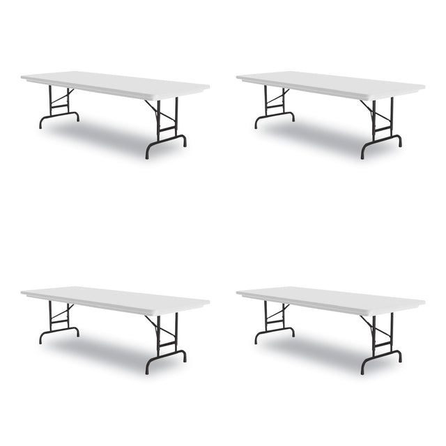 Do more with Correll Commercial Height Adjustable Plastic Folding Tables. These heavy-duty tables can adapt to nearly any event, any task, indoors or out. Simply adjust the height in 1" increments to fit the occasion. Virtually indestructible, blow-molded plastic tabletop is lightweight, waterproof, scratch- and stain-resistant. And the tops color isnt just surface deep; it goes all the way through, eliminating the possibility of it fading or wearing away. Whether youre setting up a worksurface for young artists, serving food and beverages or displaying your handmade merchandise, this tabletop can handle it all without losing its good looks. Integrated welded-steel "ladder" frame and J-channel apron paired with strong steel legs and folding mechanisms ensure maximum stability. Integrated leg locks automatically slip into place as you fold the legs down to ensure your set-up remains standing. Mar-proof plastic foot caps protect finished flooring, carpeting, cement pads whatever platform you find wherever you choose to set up. From schools to places of worship, outdoor markets to backyard barbeques, these tables deliver what you need to find success. Tables ship on a pallet to accommodate commercial addresses with loading docks. Top Color: Gray Granite; Color Family: Gray; Base Color: Black; Top Shape: Rectangular.