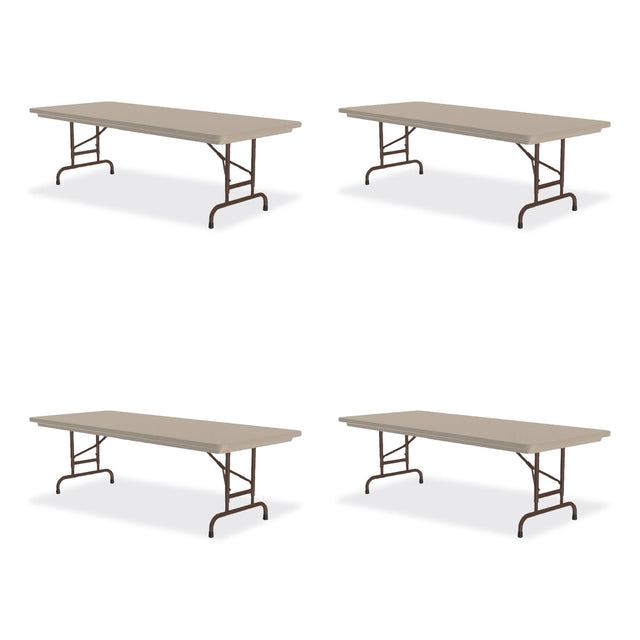 Do more with Correll Commercial Height Adjustable Plastic Folding Tables. These heavy-duty tables can adapt to nearly any event, any task, indoors or out. Simply adjust the height in 1" increments to fit the occasion. Virtually indestructible, blow-molded plastic tabletop is lightweight, waterproof, scratch- and stain-resistant. And the tops color isnt just surface deep; it goes all the way through, eliminating the possibility of it fading or wearing away. Whether youre setting up a worksurface for young artists, serving food and beverages or displaying your handmade merchandise, this tabletop can handle it all without losing its good looks. Integrated welded-steel "ladder" frame and J-channel apron paired with strong steel legs and folding mechanisms ensure maximum stability. Integrated leg locks automatically slip into place as you fold the legs down to ensure your set-up remains standing. Mar-proof plastic foot caps protect finished flooring, carpeting, cement pads whatever platform you find wherever you choose to set up. From schools to places of worship, outdoor markets to backyard barbeques, these tables deliver what you need to find success. Tables ship on a pallet to accommodate commercial addresses with loading docks. Top Color: Mocha Granite; Color Family: Brown; Base Color: Brown; Top Shape: Rectangular.
