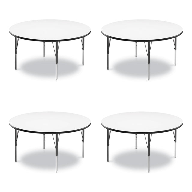 Encourage student collaboration and creativity. Activity possibilities grow exponentially when your tabletop is a dry erase markerboard. From a markerboard perspective, this activity tables high pressure laminate surface delivers far better dry erase performance than common melamine alternatives, while simultaneously providing superior scratch and stain resistance. Its also surprisingly easy to cleanfood and beverage spills, crayon marks and most paint spills wipe away with a damp cloth. The sturdy, ultra-durable tops thick, high-density fiberboard core and built-in backer sheets minimize the potential for warping, while its full-perimeter, T-mold PVC band softens and protects the tops corners and edges. Four height-adjustable steel legs with hairpin braces adjust in 1" increments to accommodate students of all agesfrom kindergarten to adult learning. Simply use the included speed-wrench for fast and easy height adjustments. Easy to assemble with pre-attached leg-mounts consisting of seven-screw mounting brackets and three-screw leg plates. Tables built to order and ship on a pallet to accommodate commercial addresses with loading docks. Top Color: White; Color Family: White; Base Color: Black/Silver; Top Shape: Round.