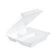 Secure closure improves handling and helps protect against accidental openings. High insulation qualities make them ideal for transporting and storing both hot and cold foods. Carryout service wouldn't be complete without them. Hinged lid containers feature the Performer perforated hinge. This one-of-a-kind feature allows the container's lid to easily be removed, making for a less cluttered dining experience and providing an extra plate for meal sharing. Food Container Type: Hinged Lid Container; Material(s): Extruded Polystyrene; Food Container Material Type: Foam; Color(s): White.