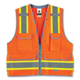 Class 2 Heavy-Duty Surveyors Vest offers serious visibility for serious professionals. Rugged materials and storage galore, this is your new favorite vest. Heavy-duty #10 zipper closure. 2" ANSI-compliant 3M Scotchlite Reflective. Reflective set on 3.5" contrasting background. Four outside pockets and one large zippered rear document/tablet pocket. Dual radio mic tabs. Apparel Type: Safety Vest; Material(s): Polyester; Color(s): Orange; Color Family: Orange.