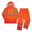 The GloWear 8376K Lightweight Hi-Vis Rain Suit Kit includes the 8366 Rain Jacket and 8916 Rain Pants for protection in wet conditions while maintaining high visibility compliance. The fully waterproof jacket and pants are constructed of rugged 150D polyester oxford with a PU coating and fully taped seams to keep workers dry. Compliant to ANSI/ISEA 107 Type R, Class 3 with reflective tape for enhanced low-light visibility. This lightweight reflective rain suit easily fits over workwear without sacrificing mobility, with an elastic waistband for comfort and snap cuffs on the pants for easy on/off over boots. Fully taped seams are bonded to keep water from sneaking in, while a vented cape-back on the jacket allows heat and moisture to escape for added breathability. An attached drawstring hood can be stowed away when not needed. The ANSI/ISEA 107-compliant high visibility polyester fabric and 2" reflective tape keeps workers highly visible at night or in low light conditions. Apparel Type: Hi-Vis Rain Suit; Material(s): Polyester; Color(s): Orange; Color Family: Orange.