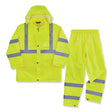 The GloWear 8376K Lightweight Hi-Vis Rain Suit Kit includes the 8366 Rain Jacket and 8916 Rain Pants for protection in wet conditions while maintaining high visibility compliance. The fully waterproof jacket and pants are constructed of rugged 150D polyester oxford with a PU coating and fully taped seams to keep workers dry. Compliant to ANSI/ISEA 107 Type R, Class 3 with reflective tape for enhanced low-light visibility. This lightweight reflective rain suit easily fits over workwear without sacrificing mobility, with an elastic waistband for comfort and snap cuffs on the pants for easy on/off over boots. Fully taped seams are bonded to keep water from sneaking in, while a vented cape-back on the jacket allows heat and moisture to escape for added breathability. An attached drawstring hood can be stowed away when not needed. The ANSI/ISEA 107-compliant high visibility polyester fabric and 2" reflective tape keeps workers highly visible at night or in low light conditions. Apparel Type: Hi-Vis Rainsuit; Material(s): Polyester; Color(s): Lime; Color Family: Green.