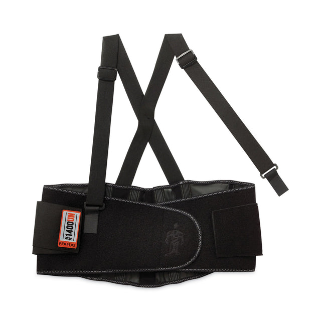 The ProFlex 1400UN Universal Size Back Support Brace provides lower-back and abdominal support for lifting heavy objects, while accommodating nearly any waist size. Universal-fit design accommodates waist sizes ranging from 25" to 58". Non-conductive polypropylene stays and comfortable-stretch 280D spandex body ensure long-lasting integrity. Before lifting heavy objects, simply tighten the support belt to enhance the bodys intra-abdominal pressure; and after lifting, just loosen the belt to achieve a wider range of motion. Secure-fit, interior rubber-track webbing prevents the belt from riding up when bending or lifting. Innovative Power Panel Positioners keep the tension bands close-to-hand, making it easy to get the desired level of tension. Adjustable, detachable suspenders allow the wearer to tailor the shoulder-fit to his or her unique needs. For best results, the support should fit snugly around the wearer's hips, with the front of the support two-fingers below the wearer's navel. When worn correctly, workers can easily maintain the proper posture for lifting, while achieving the extra support required to safely complete the task. Easy-to-use hook-and-loop closure keeps the belt securely fastened while in use. Brace can be worn over or underneath clothing. Machine washablemachine-wash cold and air dry. General Category: Work/Safety Gear; Sub-Category: Work Harness; Color(s): Black; Color Family: Black.