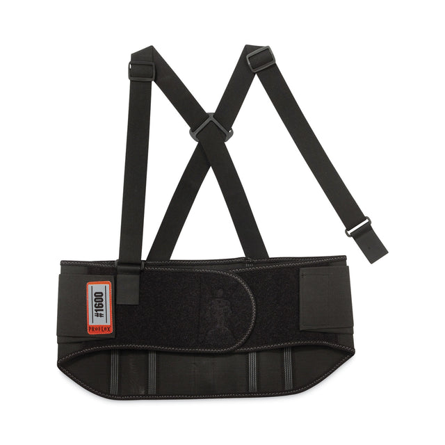 The ProFlex 1600 Standard Elastic Back Support Brace is designed to remind workers of proper lifting techniques while also enhancing the body's intra-abdominal pressure, moving the stress away from the spine for back-pain relief. Premium, all-elastic body with a 9" wide belt provides extra-firm support, and a contoured, high-cut front panel delivers a more comfortable fit. Before lifting heavy objects, simply tighten the support belt to enhance the bodys intra-abdominal pressure; and after lifting, just loosen the belt to achieve a wider range of motion. Secure-fit, interior rubber-track webbing prevents the belt from riding up when bending or lifting. Innovative Power Panel Positioners keep the tension bands close-to-hand, making it easy to get the desired level of tension. Non-conductive polypropylene stays help ensure long-lasting integrity. Adjustable, detachable suspenders allow the wearer to tailor the shoulder-fit to his or her unique needs. For best results, the support should fit snugly around the wearer's hips, with the front of the support two-fingers below the wearer's navel. When worn correctly, workers can easily maintain the proper posture for lifting, while achieving the extra support required to safely complete the task. Easy-to-use hook-and-loop closure keeps the belt securely fastened while in use. Brace can be worn over or underneath clothing. Machine washablemachine-wash cold and air dry. General Category: Work/Safety Gear; Sub-Category: Work Harness; Color(s): Black; Color Family: Black.