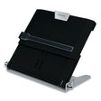 Places documents between monitor and keyboard for optimal viewing. Top and bottom adjust to accommodate oversized documents. Offers six separate angle adjustments from 75 to 25 incline. Moveable, magnetic line guide securely holds documents. Supports books, catalogs and landscape sheets. Stable weighted base that folds flat for easy storage. Holds: A4; Legal; Letter; Oversized; Mounting: Free Standing; Material(s): Plastic; Sheet Capacity: 250.