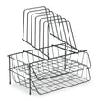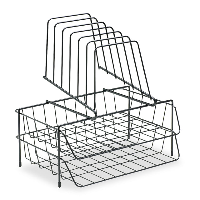 Fellowes wire double tray with step file helps to organize and prioritize. Space-saving design incorporates two side load letter-size trays under a step file sorter. Sturdy, sleek wire construction. Rubber feet. 100% recyclable. Perfect for you office or home office, school, or anywhere you need to organize your important papers and documents. Step File SorterEasy-view graduated step file with six compartments. Number of Compartments: 8; For File Size: Letter; Load Orientation: Side; Color(s): Black.