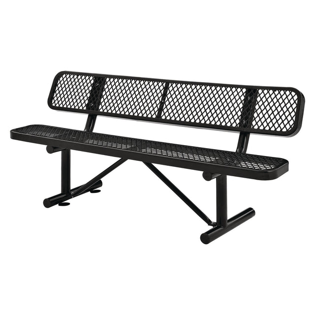 This commercial metal bench is perfect for outdoor spaces such as campuses, parks, and transportation stops, providing comfortable seating for visitors. It is coated with a thermoplastic material and zinc layer that resists corrosion, fading, mold, and vandalism, ensuring that it remains maintenance-free and durable for any outdoor environment. Color: Black; Color Family: Black; Overall Width: 72"; Overall Depth: 24".