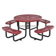 This collection of Expanded Steel Picnic Tables is made with galvanized steel and a zinc powder-coat finish for durability and protection against the elements. Featuring a mesh design, these metal picnic tables are comfortable and perfect for outdoor events. The expanded metal picnic table is able to retain structural integrity throughout use. Top Color: Red; Color Family: Red; Base Color: Red; Top Shape: Round.