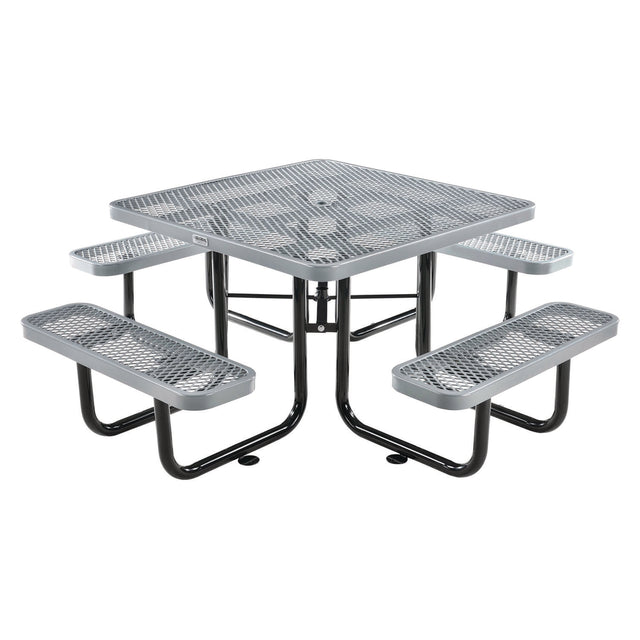 This collection of Expanded Steel Picnic Tables is made with galvanized steel and a zinc powder-coat finish for durability and protection against the elements. Featuring a mesh design, these metal picnic tables are comfortable and perfect for outdoor events. The expanded metal picnic table is able to retain structural integrity throughout use. Top Color: Gray; Color Family: Gray; Base Color: Gray; Top Shape: Square.