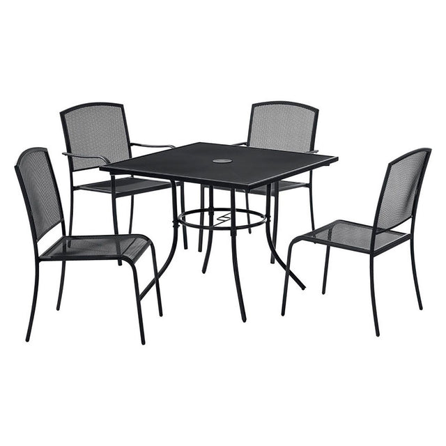 Give patrons or guests a new place to sit on your outdoor grounds. The Interion Outdoor Caf Table & Chair set is ideal for cafs, restaurants, lounges, patios, and a variety of other food service areas with outdoor dining locations. Made of commercial grade steel with a zinc rich black powder-coat finish to help prevent rust and corrosion. Top Color: Black; Color Family: Black; Base Color: Black; Top Shape: Square.