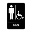 Universally and easily recognizable white graphics. Raised tactile graphics with grade 2 braille. Meets Americans with Disabilities Act (ADA) requirements. Includes double-side adhesive tape for mounting to door or wall. Frame Color: Black; Size: 6 x 9; Message(s): Men (with Wheelchair); Material(s): Plastic.