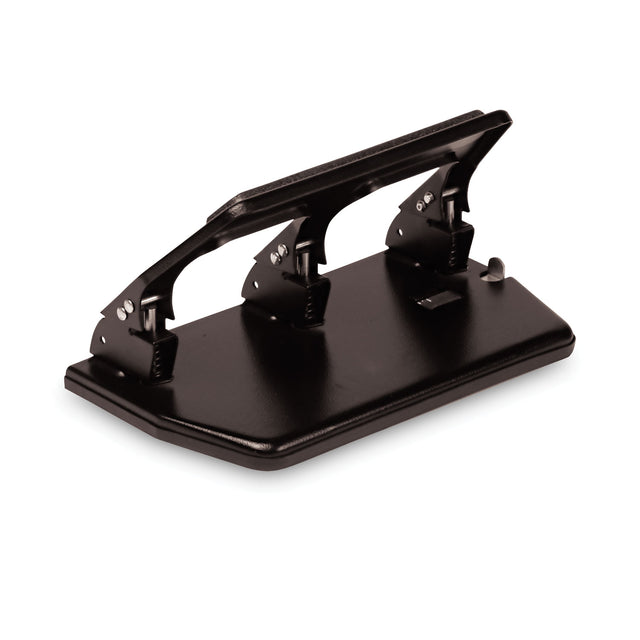 Add comfort to punching tasks with soft-touch gel padded handle. Adjustable paper centering guide ensures accurate punching. Pre-set to punch holes to fit a standard three-ring binder. Lock-down handle; large capacity chip pan. Non-skid feet to keep punch in place while punching. Durable steel construction. Sheet Capacity: 30; Operating Method: Manual; Number of Holes: 3; Hole Diameter: 9/32".
