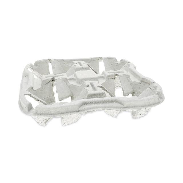 EarthChoice fiber cup carriers are extremely durable and made with 100% recycled paper. Made with globally sourced materials. Ready to use with no set up required. Makes transporting on the go beverages simple and mess free. Features a sturdy multi compartment design to accommodate up to four cups ranging from 8 to 46 oz. Cup CarrierFour-cup carrier, 8 oz to 46 oz. Cup Size (Range): 8 oz to 46 oz; Capacity (text): Four Cups; Material(s): Molded Fiber; Color(s): Natural.