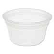 Clear, smooth-wall design enables easy order recognition. Tight, leak-resistant seal protects contents from contamination and helps prevent messy leaks and spills. Exceptional temperature resilience enables use in freezers, refrigerators and microwaves. Stackable, nest-style storage helps you make the most of your workspace. Food Container Type: Base; Material(s): Polypropylene; Material Type: Plastic; Interior Volume Capacity: 12 oz.
