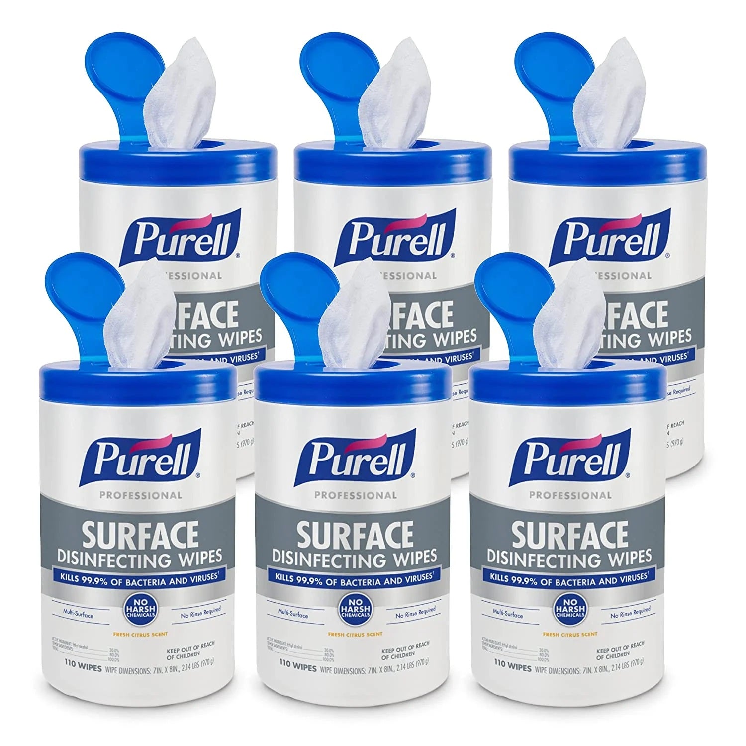 PURELL Professional Surface Disinfecting Wipes, 1-Ply, 7 x 8, Fresh Citrus, White, 110/Canister, 6 Canisters/Carton (934206CT) is backordered and will ship as soon as it is back in stock.