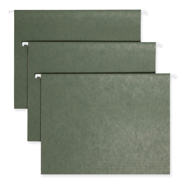 The popular choice for desk drawer files, hanging folders keep papers neatly vertical in the file. Lighter green on the inside of the folder helps prevent accidental filing of papers between folders. Most popular choice for desk drawer filing. Coated rod tips allow smooth gliding. Made of 11 point standard green stock ideal for everyday use. Folder Size Type: Letter; Folder Color: Standard Green; Color Family: Green; Folder Material: 11-pt Stock.