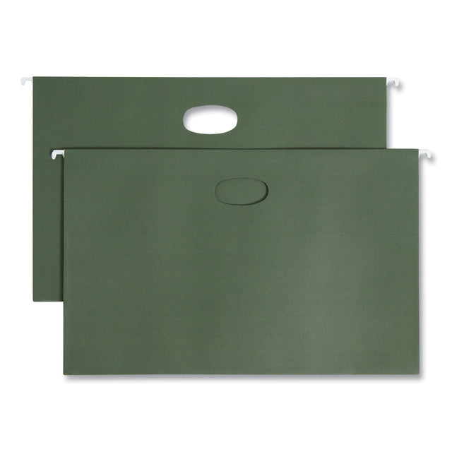 Hanging pockets are ideal for storing large amounts of paperwork. Full-height sides keep the pocket from getting caught when trying to take them out of a drawer or box. Documents are also better protected and secured in the pocket. Die cut handles allow for lifting and transporting. Great for files that need to be frequently removed from the file drawer. Folder Size Type: Legal; Max Folder Expansion: 3.5"; Folder Color: Standard Green; Color Family: Green.
