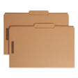 Keep papers secure and in order, even when folders are handled by lots of people and transported out of the office. Items with reinforced tab have added strength at point of greatest wear. Fasteners keep papers secure and in order. Expands 0.75" for greater storage capacity. Choose one or two fasteners to subdivide and keep papers secure. 2" prong K-style fasteners. Guide-Height 2/5-Cut Tabs11-pt Kraft. Folder Size: Legal; Total Number of Dividers: 0; Total Number of Fasteners: 2; Max Folder Expansion: 0.75".
