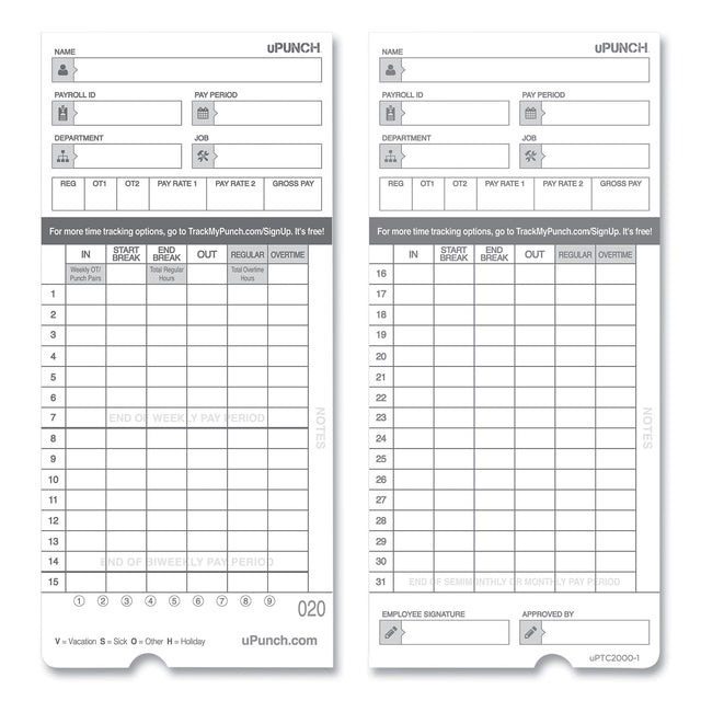 Time Clock Cards for uPunch HN4000, Two Sides, 7.37 x 3.37, 50/Pack (HNTCL2050)